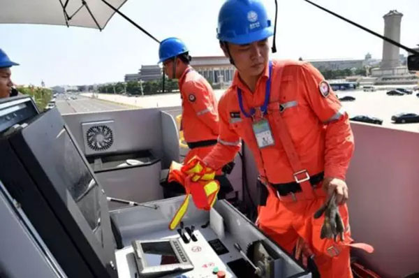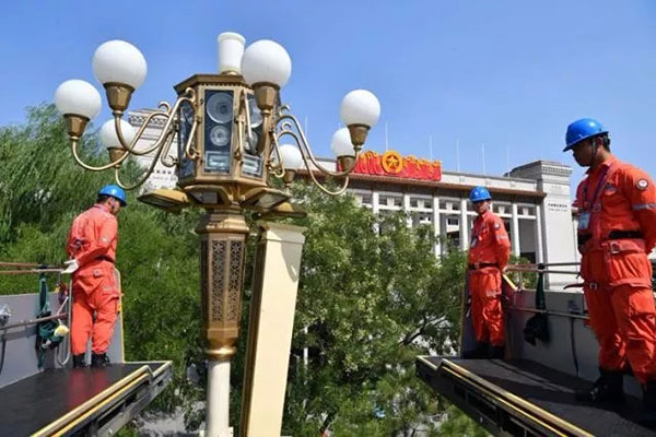 华灯作为天安门广场上标志性的景观和照明设施,是国家名片和举国繁荣的象征。为迎接中华人民共和国七十华诞,北京市城市照明管理中心于7月31日下午开始了对长安街253座华灯、6000多盏光源的全面清洗检修工作。