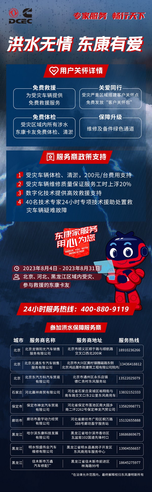 暴雨洪水中,东风康明斯冲锋在前,用行动践行社会责任,为灾区人民送上一份温暖。东风康明斯“东康家服务”为支援抵抗洪涝灾害工作,全力保障东康客户投入区域救援及正常运营,迅速出台一系列服务保障政策,包含了免费救援、免费体检、技术专家团队24小时专项技术援助等多项关怀服务。